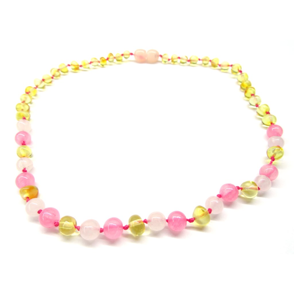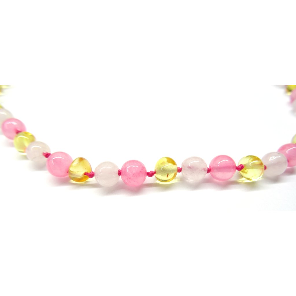 jantárové korálky pre deti sú vyrobené z prírodného oblého ohlazeného jantáru a ďalej ruženínu a ružového jadeitu (lisované do tvaru pravidelných kamienkov) - sú leštené, majú bezpečný skrutkovací poistný uzáver vhodný pre alergikov (teda bez obsahu niklu) a každý korálek je zaistený pre prípad pretrhnutia zvlášť uzlíkom .