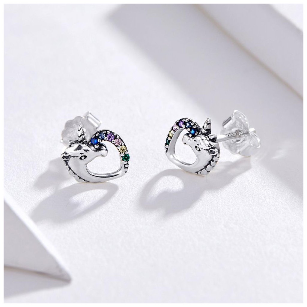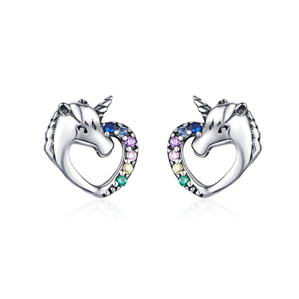 Strieborné náušnice jednorožec v srdci - farebné zirkóny